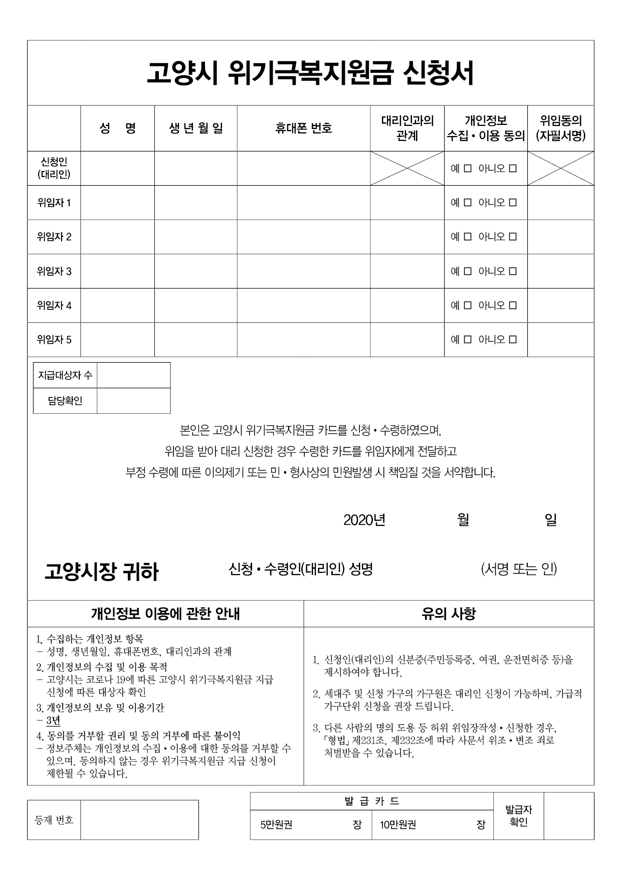 고양시 위기극복지원금 신청서를 프린트하셔서 작성하시면 됩니다.