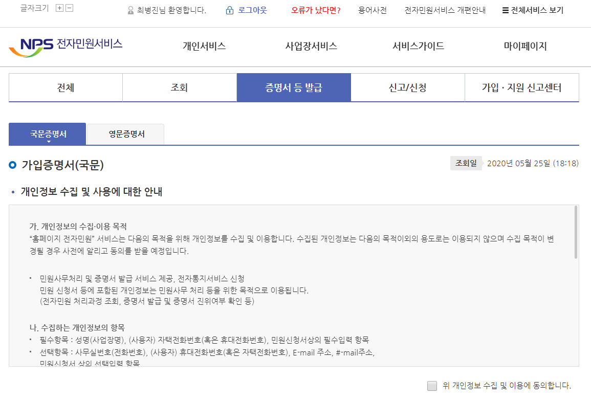 새로운 직장으로 취업하거나, 혹은 이직시 직장에서 국민연금 가입증명서를 발급 후 제출하라고 할 때가 있습니다.
