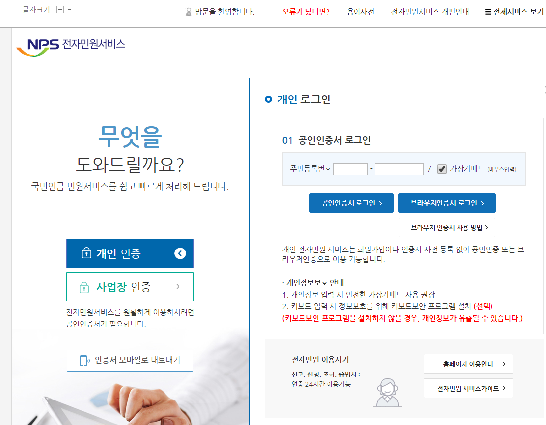 국민연금 홈페이지에 접속하시면 위 화면과 같이 발생합니다.