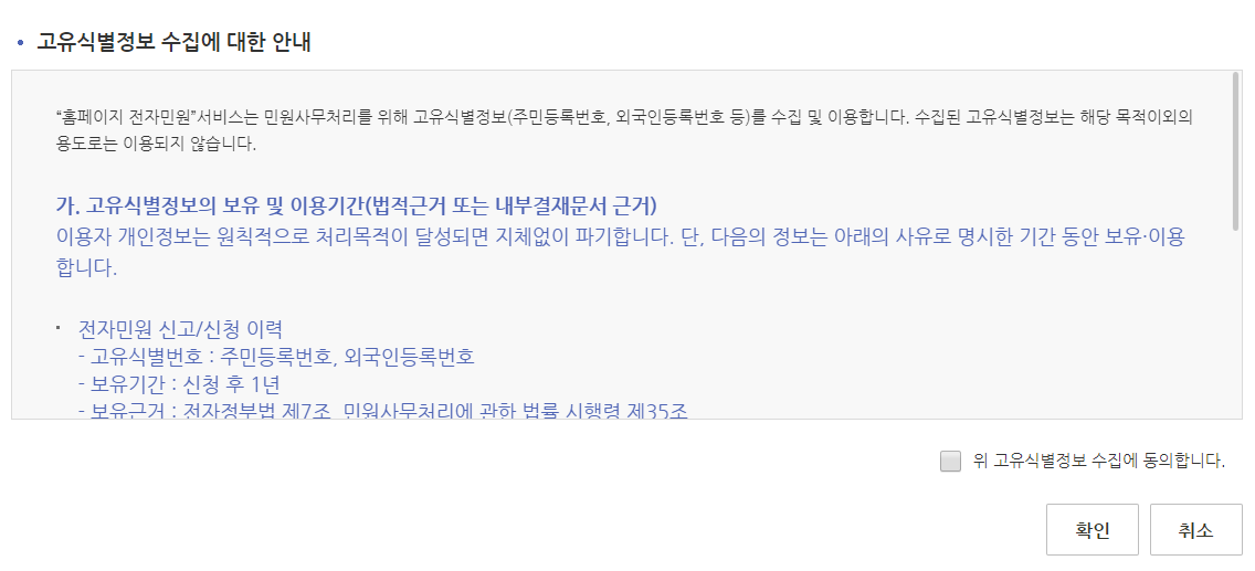 개인정보 수집 및 사용에 대한 안내의 동의, 고유식별정보 수집에 대한 안내의 동의