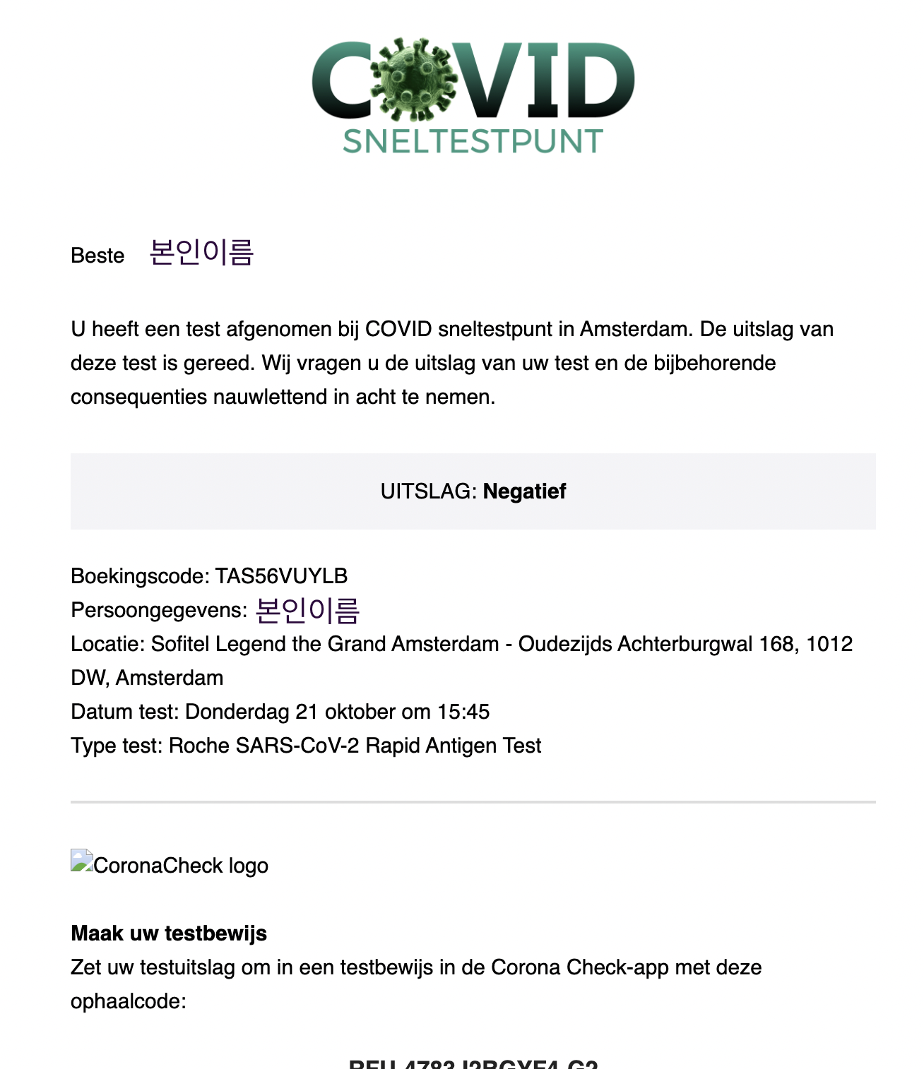 그러고 가서 여권을 보여주고 검사를 완료하면 잠시후에 메일로 결과가 발송된다.