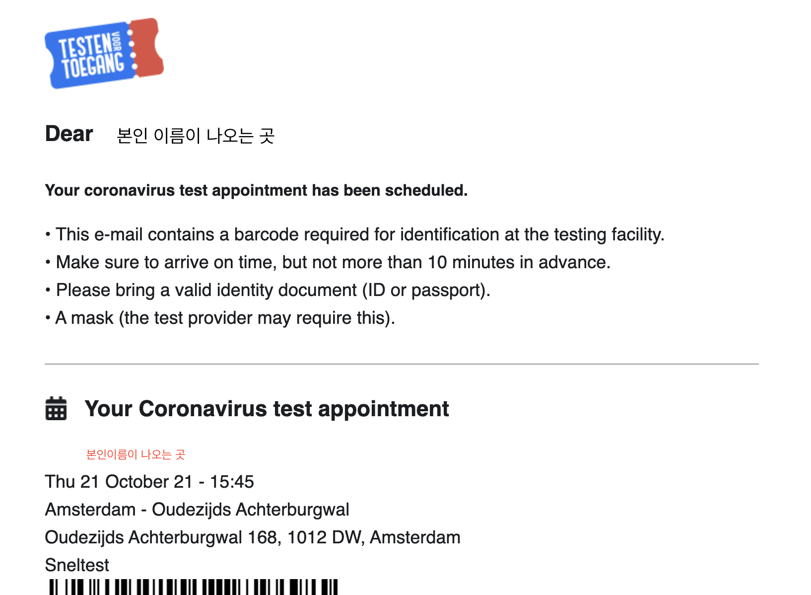 이렇게 밑에 바코드가 날라오고, 예약한 곳의 주소도 나오니 시간에 맞춰서 가면 된다.