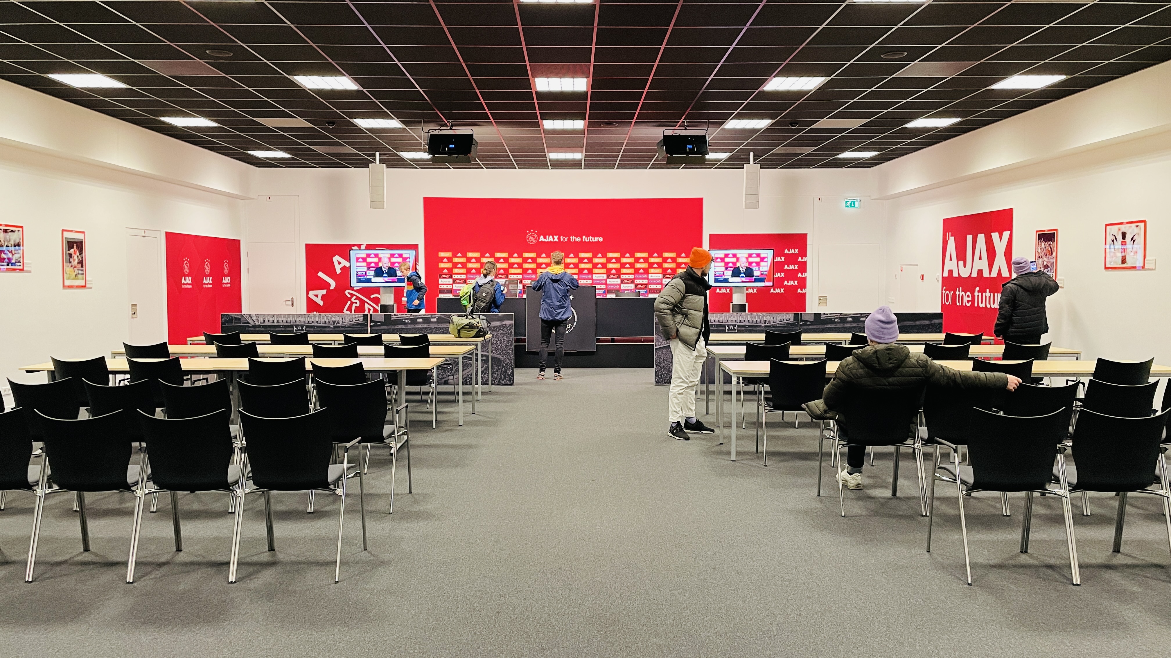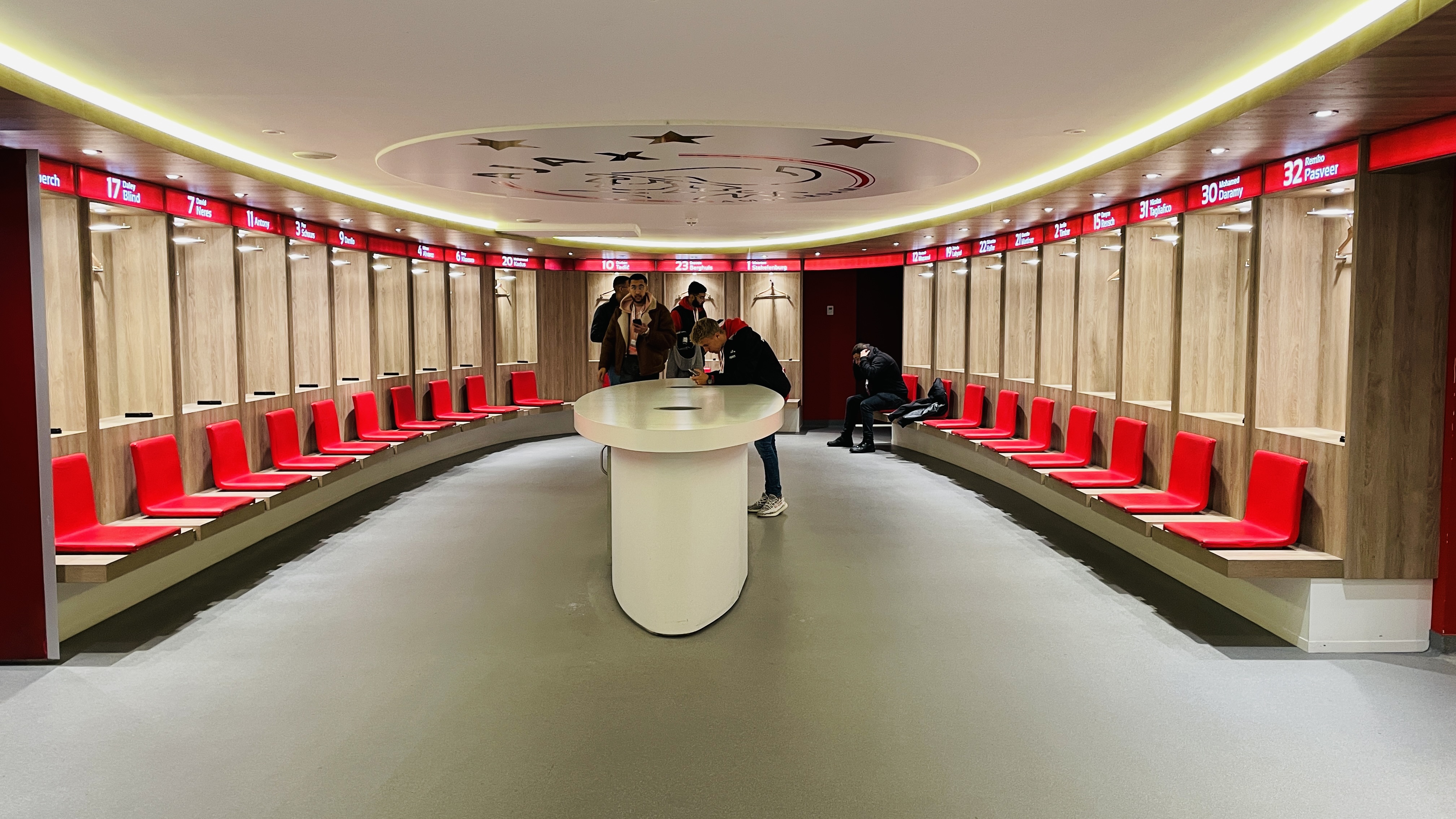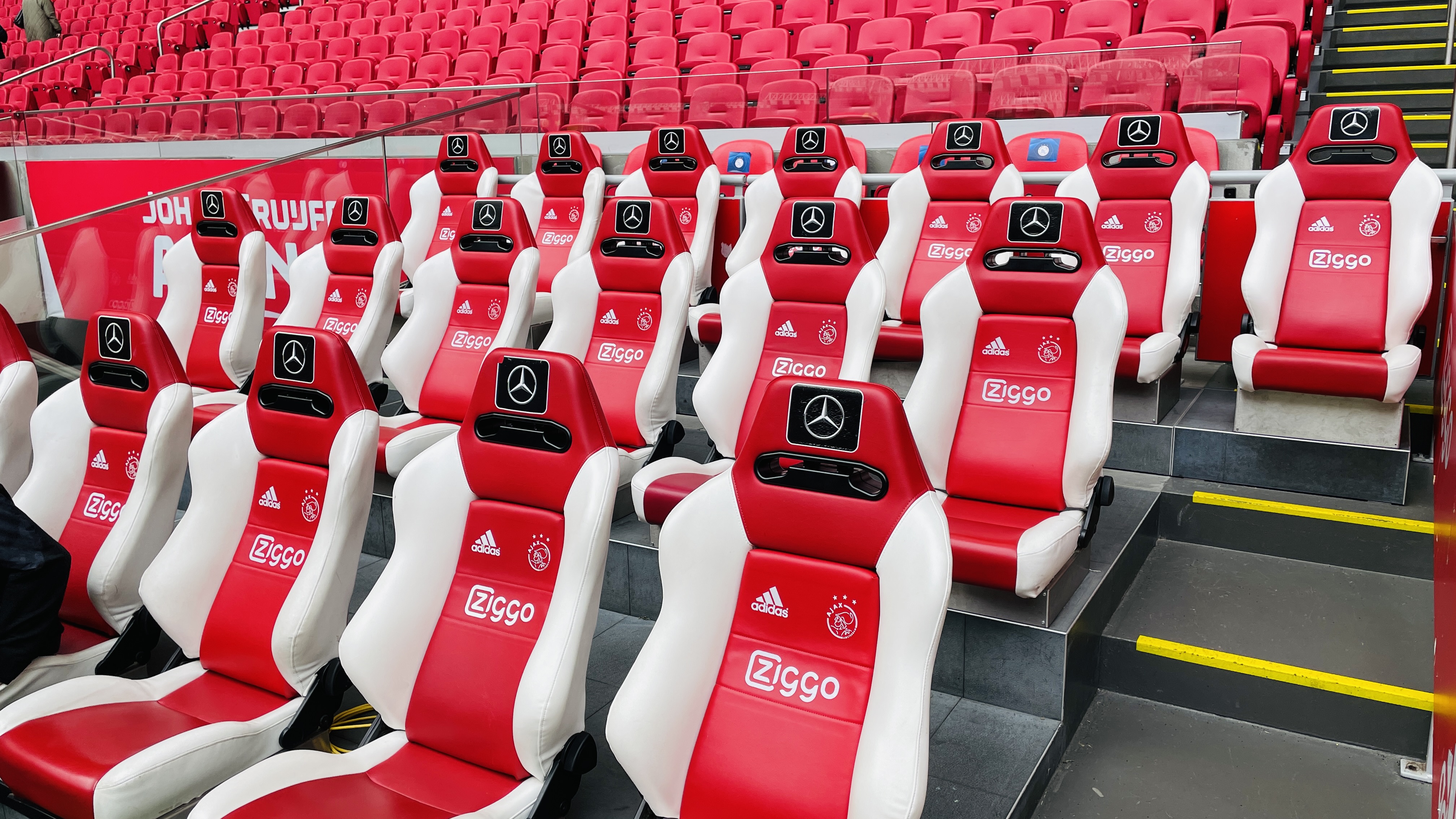 의자에는 아약스의 스폰서인 지고스포츠와 벤츠의 로고가 걸려있다.