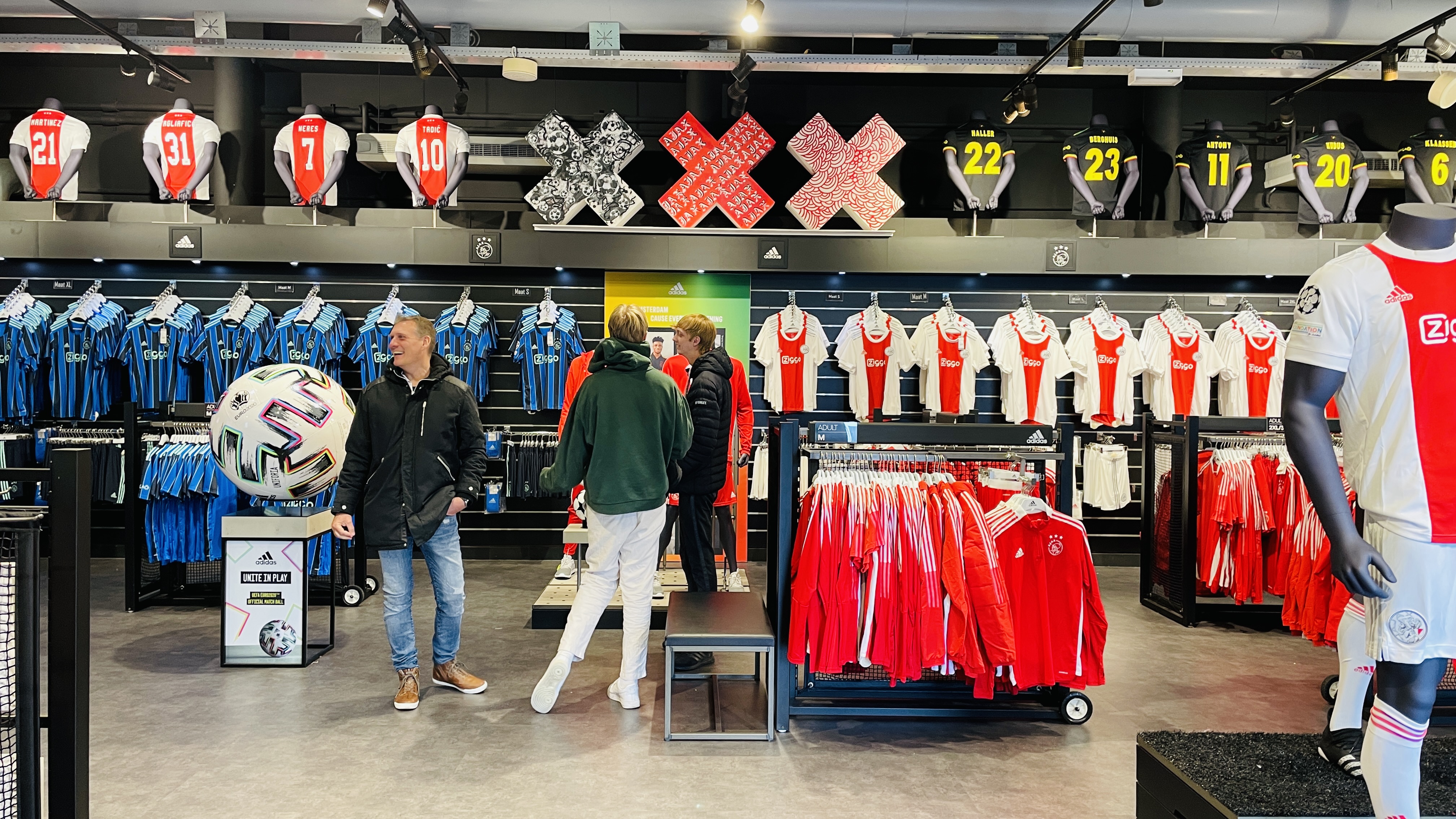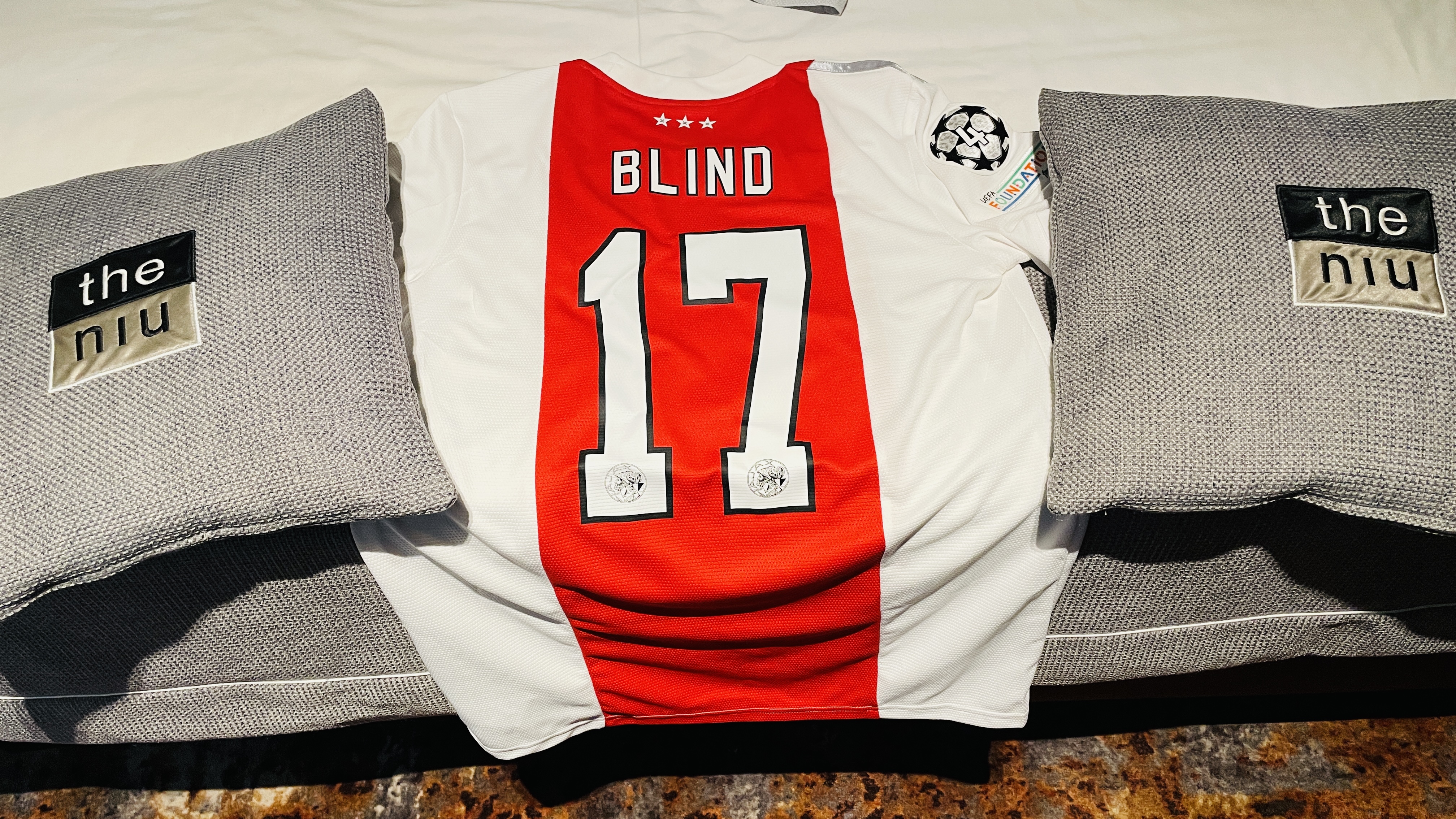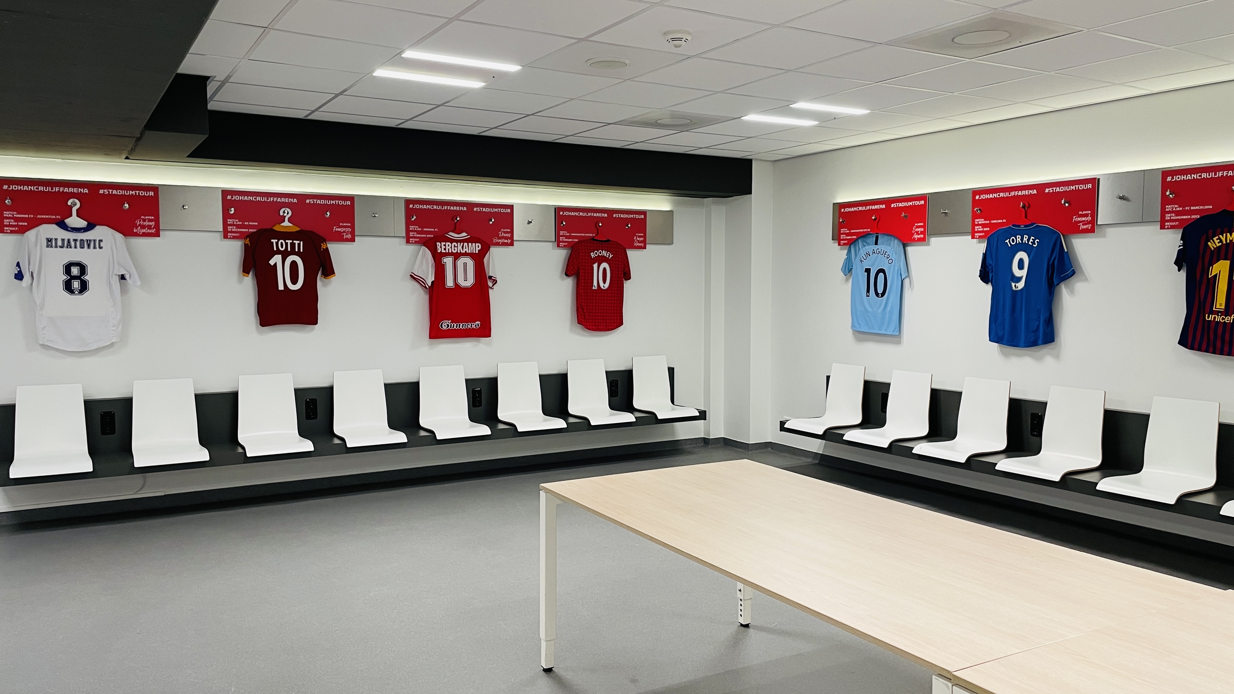 의자에는 아약스의 스폰서인 지고스포츠와 벤츠의 로고가 걸려있다.
