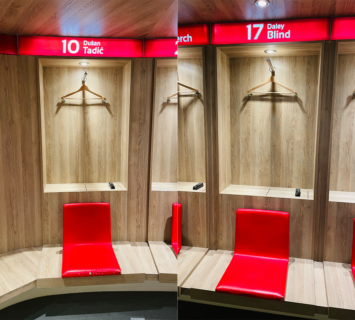 선수들 이름이 하나하나 새겨져있고, 의자 뒤에는 개인 사물함도 있으며 안에는 샤워장이 최첨단 식으로 설치되어 있었다.