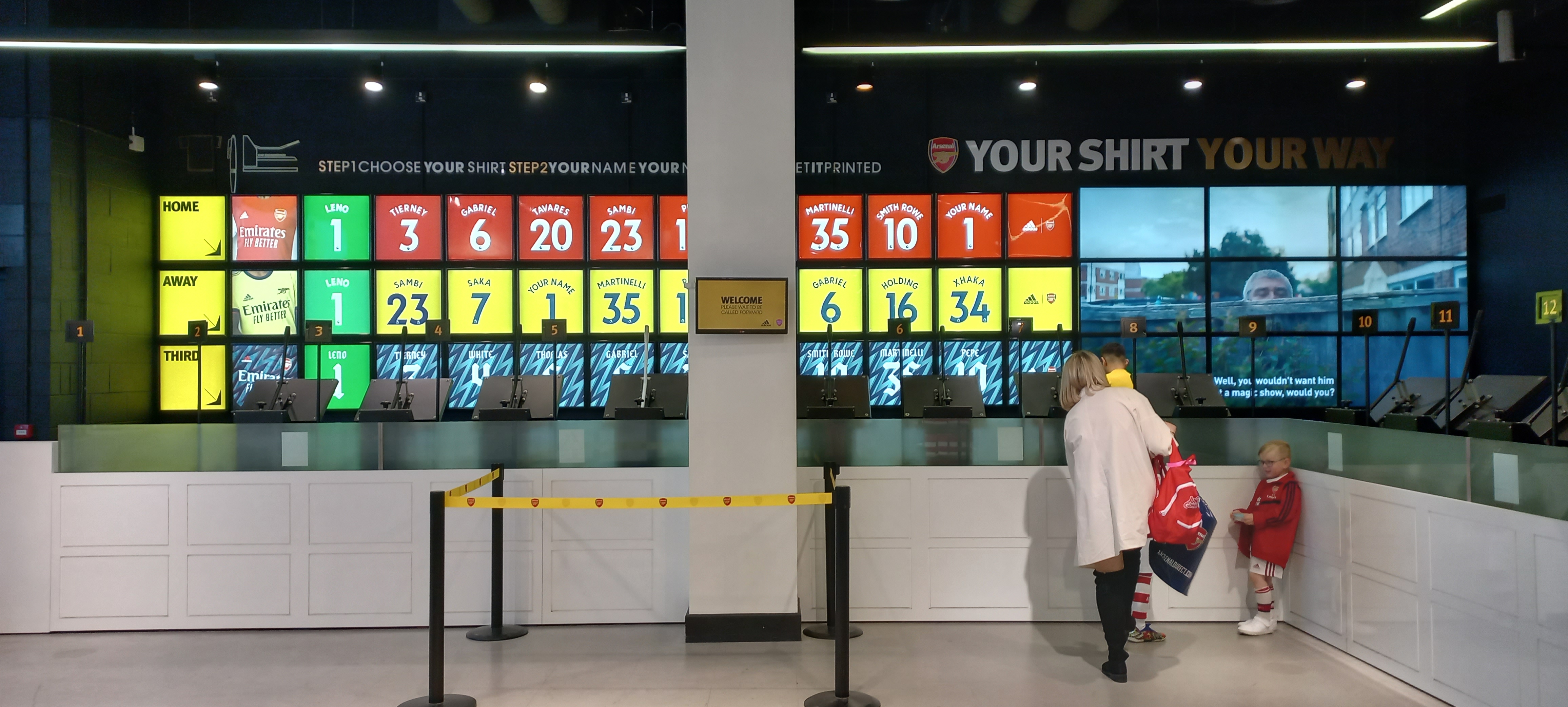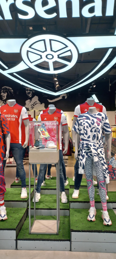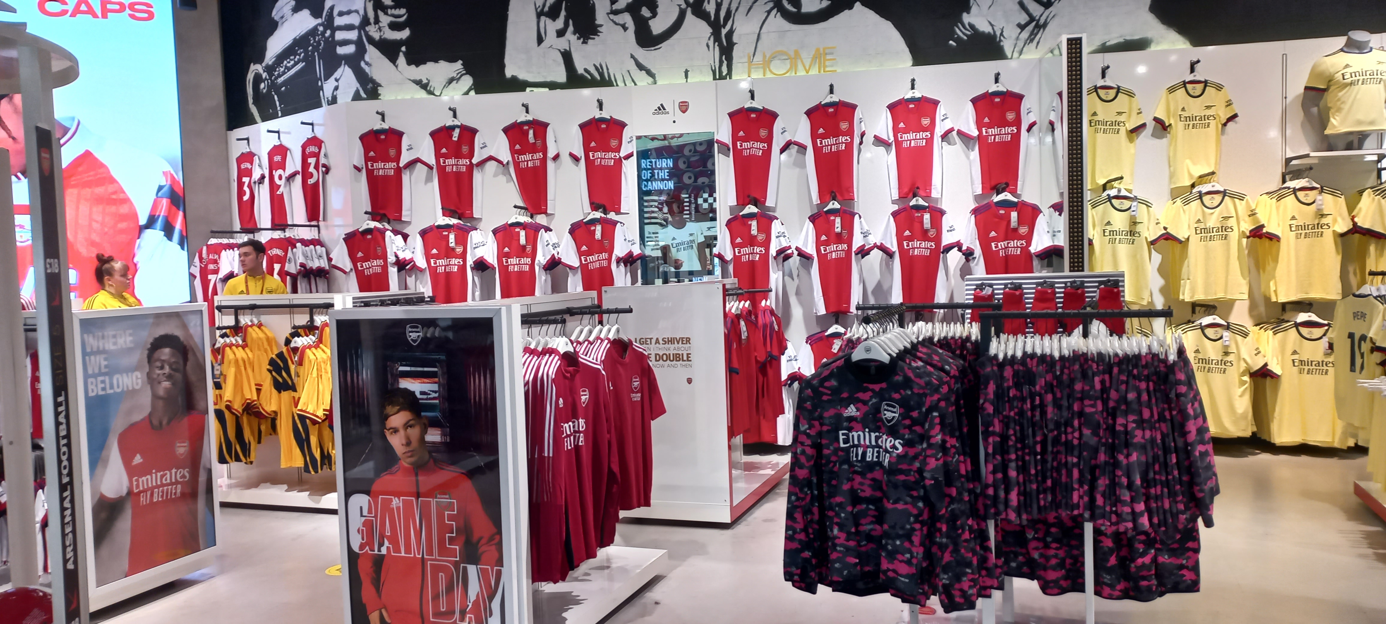 이렇게 아스날의 유니폼과 트레이닝 셔츠들을 착용한 마네킹이 여러분을 기다리고 있다.