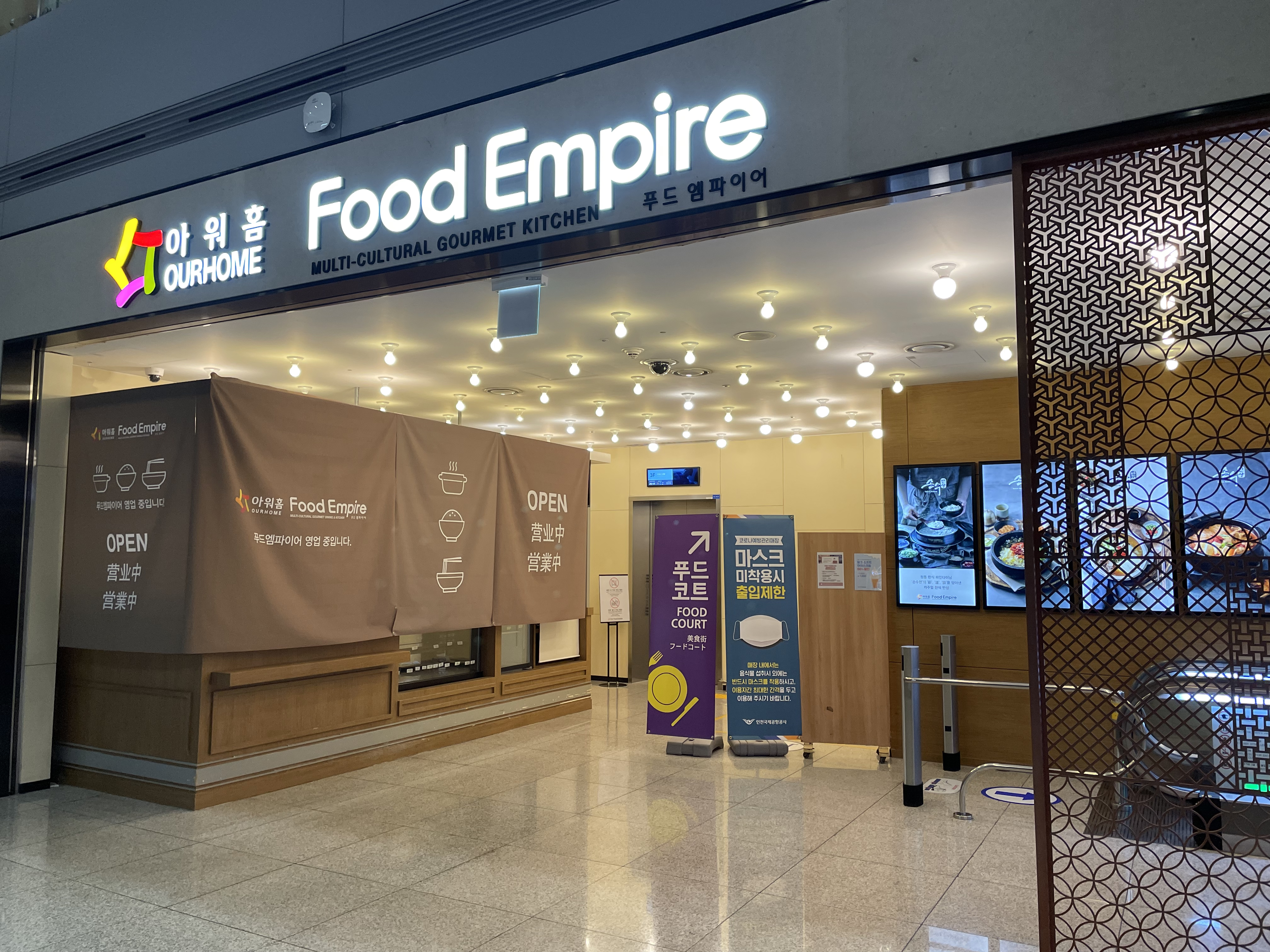 4번 출국심사게이트를 이용해서 나오신다면 바로 앞의 3거리에서 보이는 이 푸드코트는 20:00까지만 이용이 가능합니다.