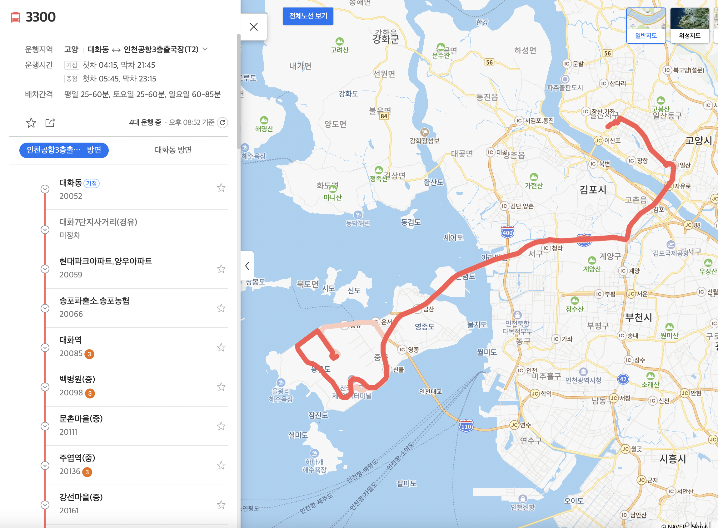 일산의 발 명성운수 소속 3300번 버스 노선도