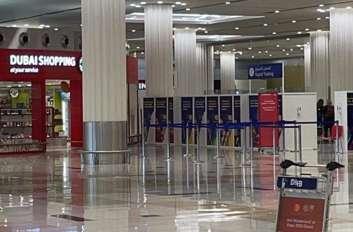 "두바이 공항 터미널 3 출발층에 들어와서 왼쪽으로 쭈욱 가면 Dubai Shopping과 Costa Coffee 사이에 Rapid Testing이 있다"