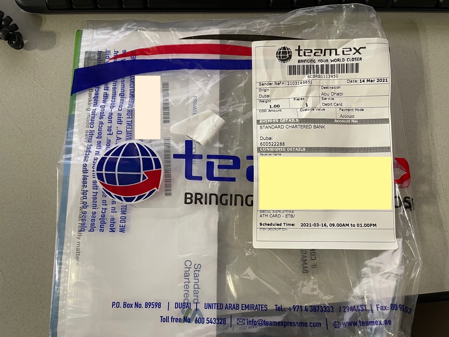 카드는 두바이에서 배달되고, 봉투에 담은 후 다시 편지봉투라니