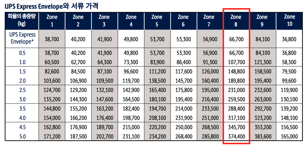 UAE의 경우 Zone 8로 지정되어 있으며, 다음과 같은 요율로 결정됩니다.