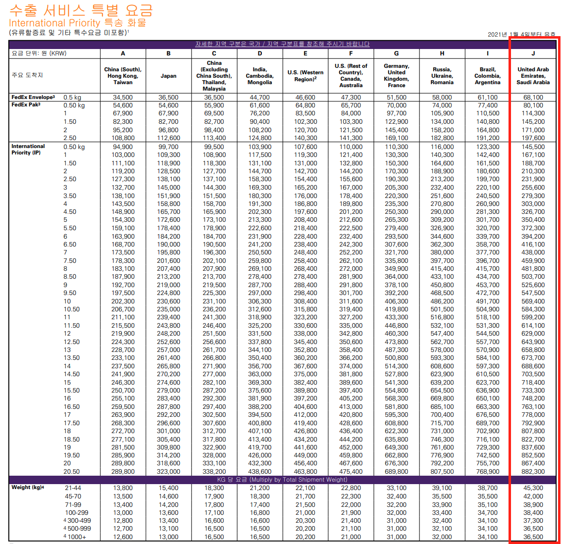 Fedex의 경우 지역을 Zone J로 구분하였으며, 다음의 문서로 요율을 확인할 수 있습니다.