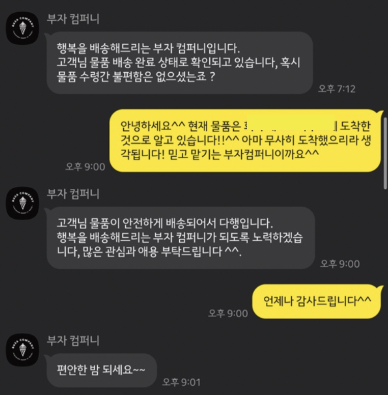 배송이 완료되면 다음과 같은 메세지를 다시 받을 수 있게 됩니다.