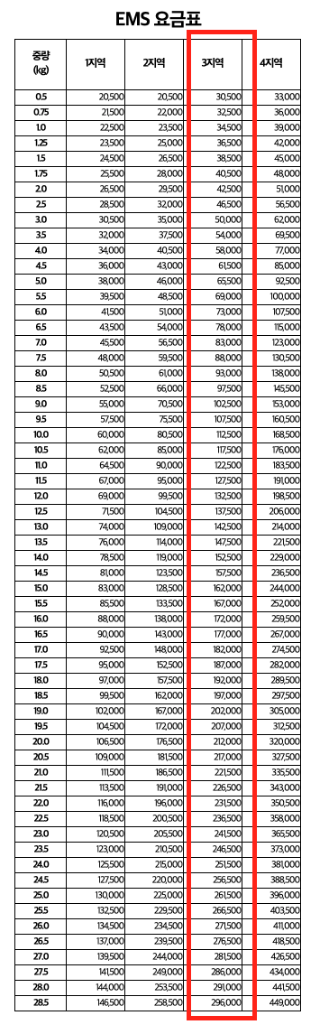 EMS의 경우 UAE는 3지역으로 분류되어 있으며 다음과 같은 요율이 책정되어 있습니다.
