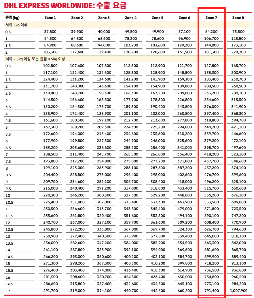 DHL의 경우 Zone 7으로 규정되어 있으며 요금은 다음의 문서를 통해 확인할 수 있습니다.