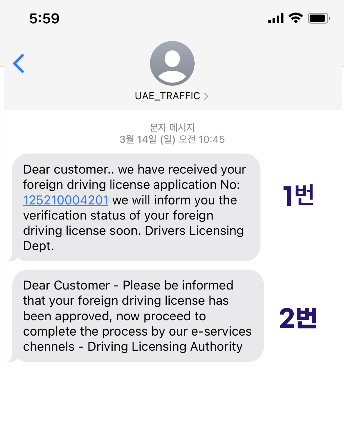 2번 문자의 경우 대충 요약하자면 "당신의 외국인 운전면허가 승인되었다는 것을 알려준다, 이제 e-services 채널을 통해 남은 프로세스를 완료해라'라는 문자입니다.