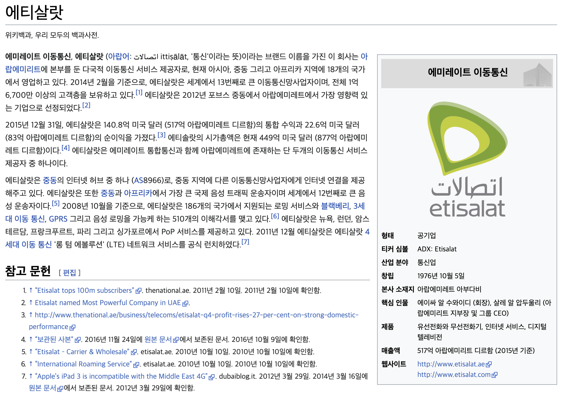 에티살랏 정보를 알고 싶으면 위키백과에서 발췌한 내용으로 대신합니다.