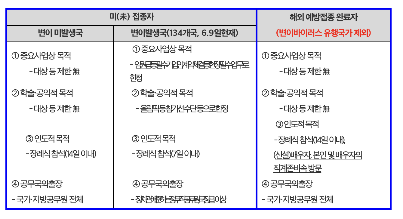 7월 1일부터는 기존에 격리면제가 허용가능했던 범위를 재외국민과 유학생 등에게 국내에 거주하는 직계존비속을 방문하는 경우에도 추가적으로 격리면제를 인정한다고 합니다.