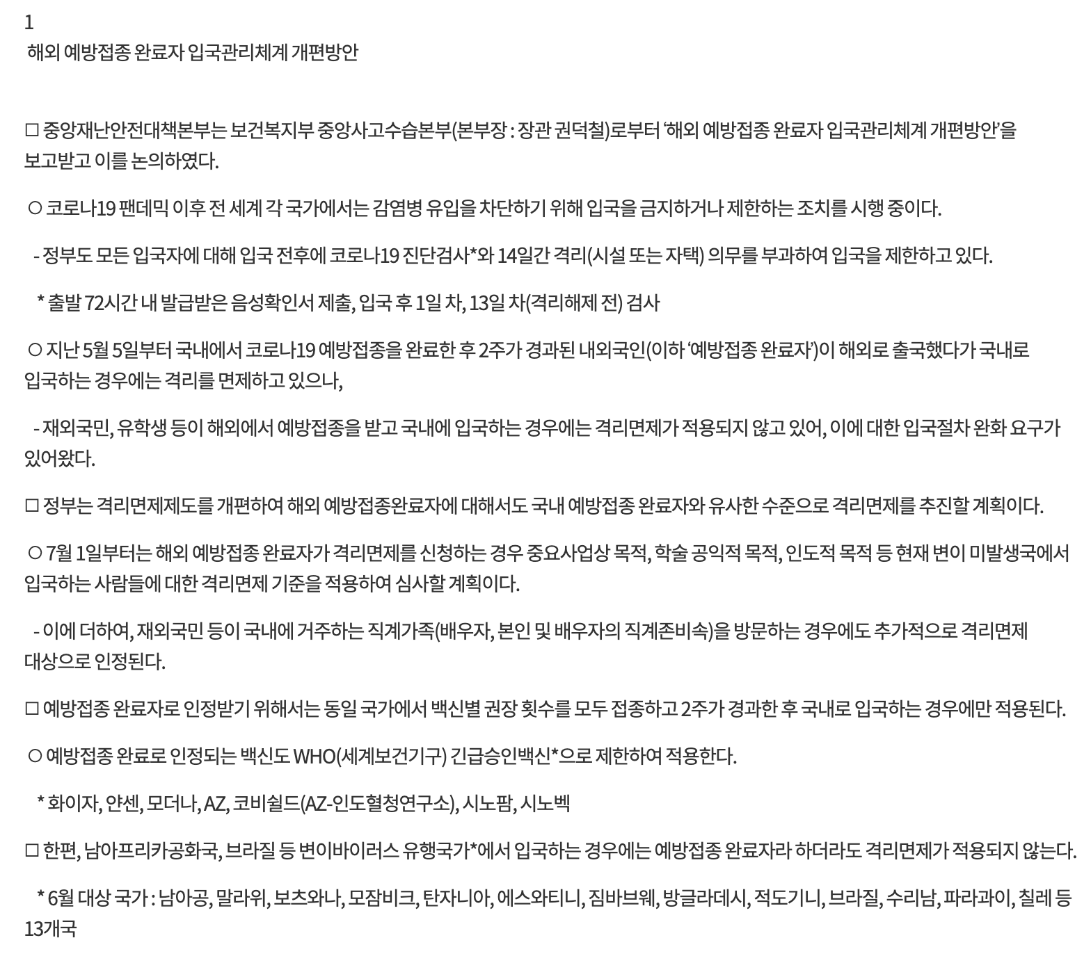 모든 입국자에 대해서 반드시 출발하려는 국가에서 출국 전 72시간 내에 발급한 음성확인서를 제출해야 되며, 입국후 1일차와 13일차에 검사를 진행하고 있으나 지난 5월 5일부터는 국내에서 백신접종을 완료하고 2주가 경과한 자에 한하여 격리면제를 진행중이나, 재외국민과 유학생등에 대해서는 허용되지 않는 점이 있었고, 이 요구가 끊임없이 있어왔다고 합니다.