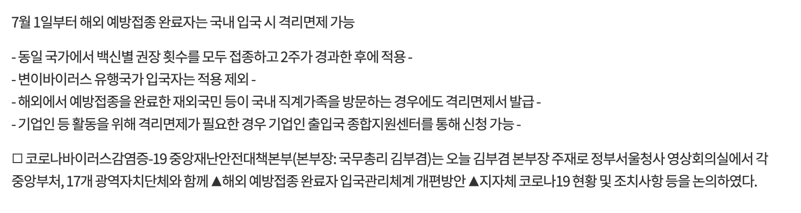 그것은 바로 7월 1일부터 해외백신 접종완료자에 대한 자가격리 면제!!