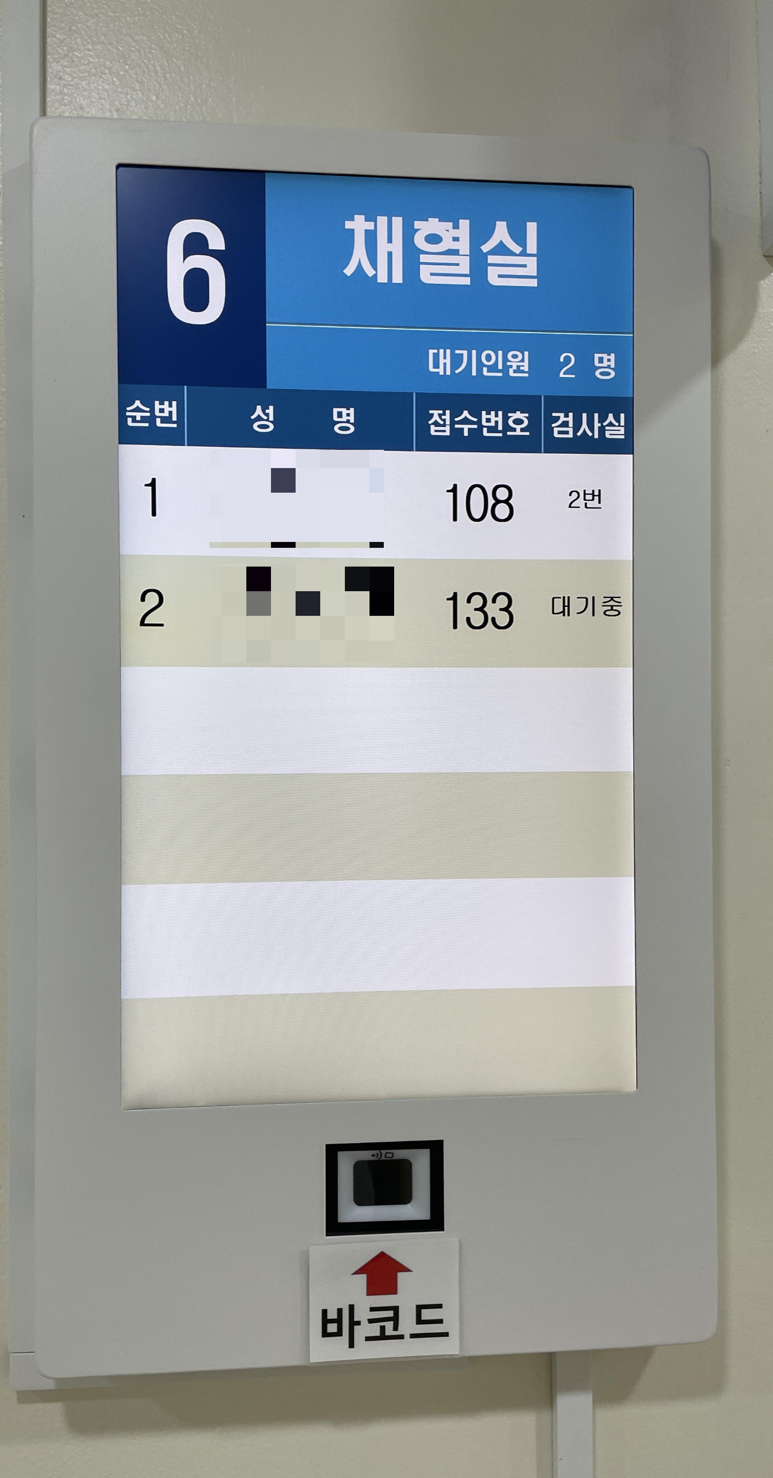 뭐 물론 본인이 받을 검진실을 돌아다니면서 기다리면 되지만 사진 아래쪽에 본인의 바코드를 스캔해야 대기리스트에 올라간다