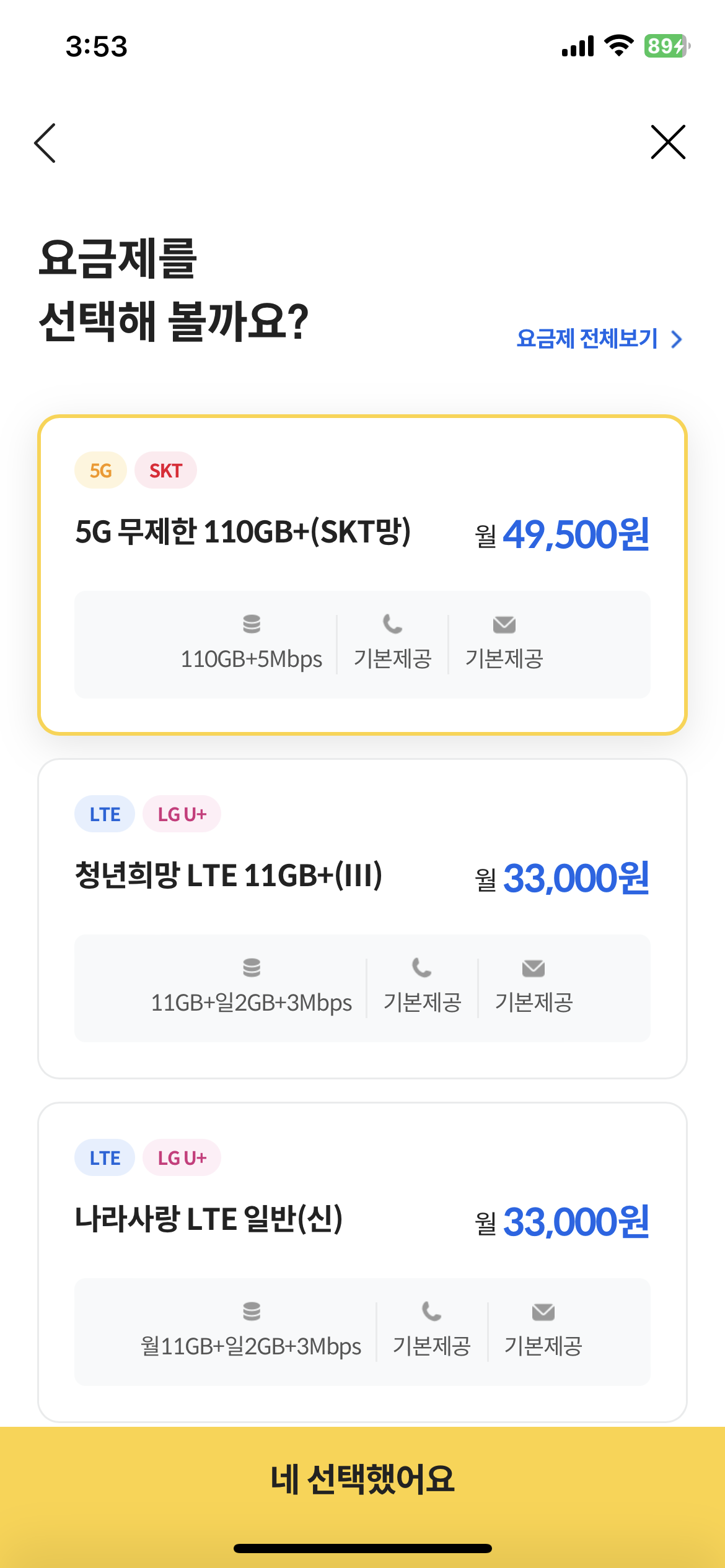 다음 화면으로 넘어가면 요금제를 선택하는 화면이 나온다