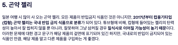 곤약젤리의 경우 컵형만 반입금지였다. 컵형의 곤약젤리가 탄력성이 높아 많은 분들이 질식한 경험을 가지고 있다고 한다.