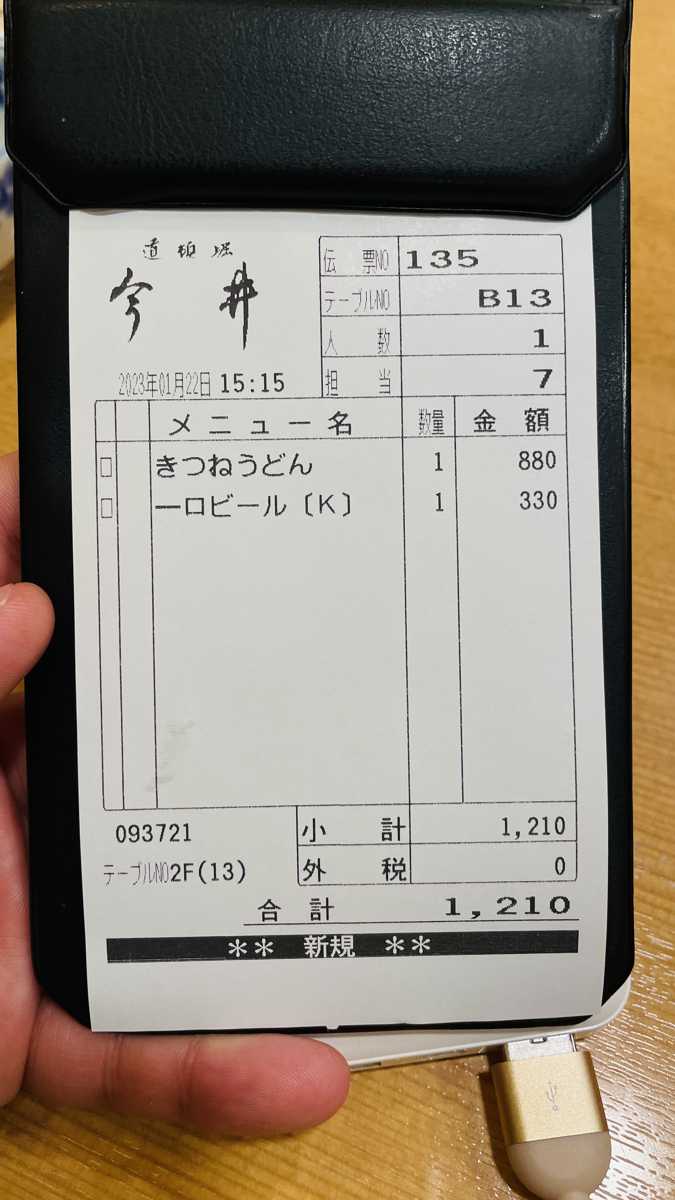 생맥주와 우동 하나 시키니 1210엔이 나왔다