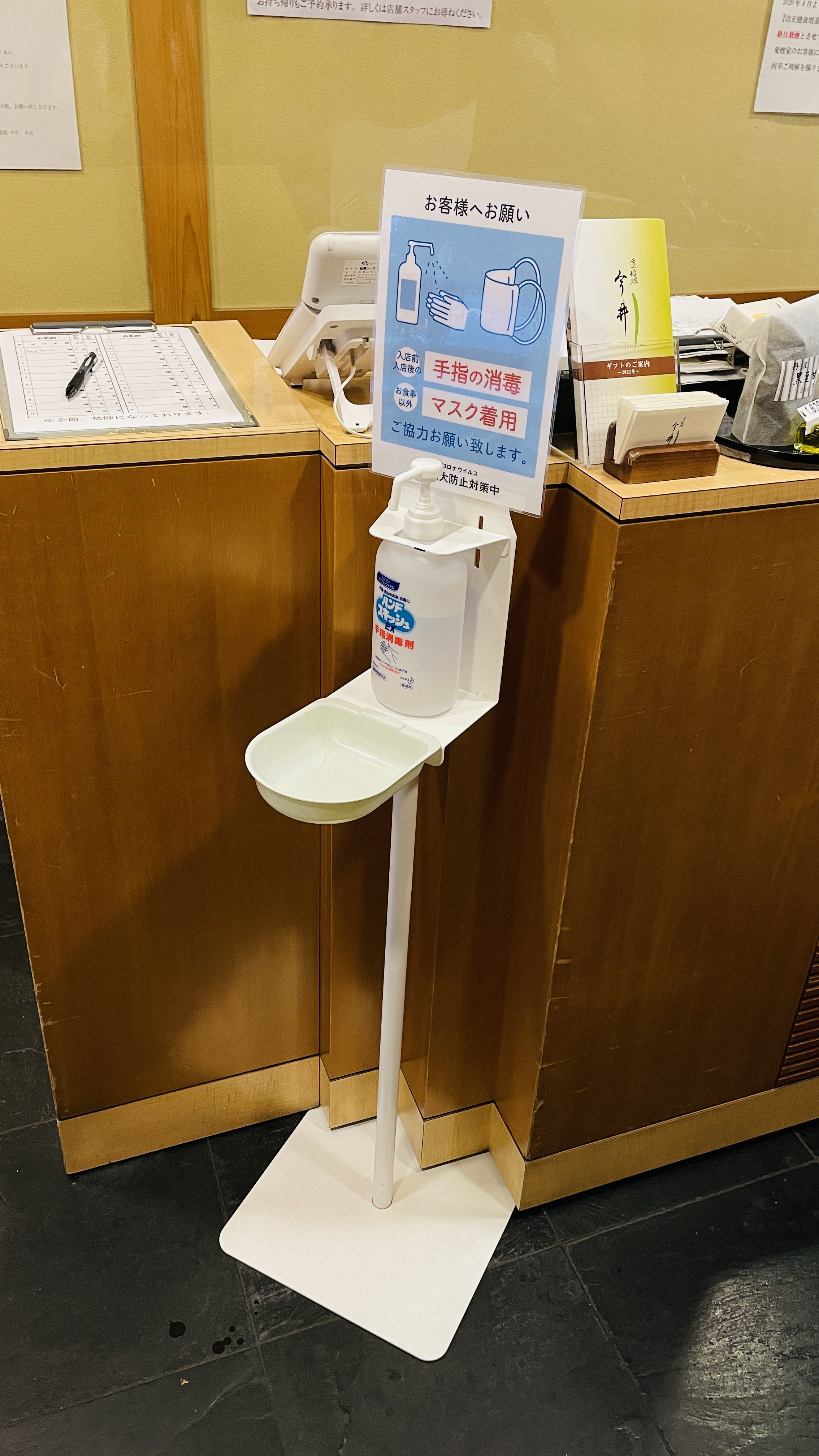 매장 안에 들어가면 왼쪽과 같이 몇명인지를 작성하는 방문록과 손 소독을 할 수 있는 소독제가 마련되어 있다