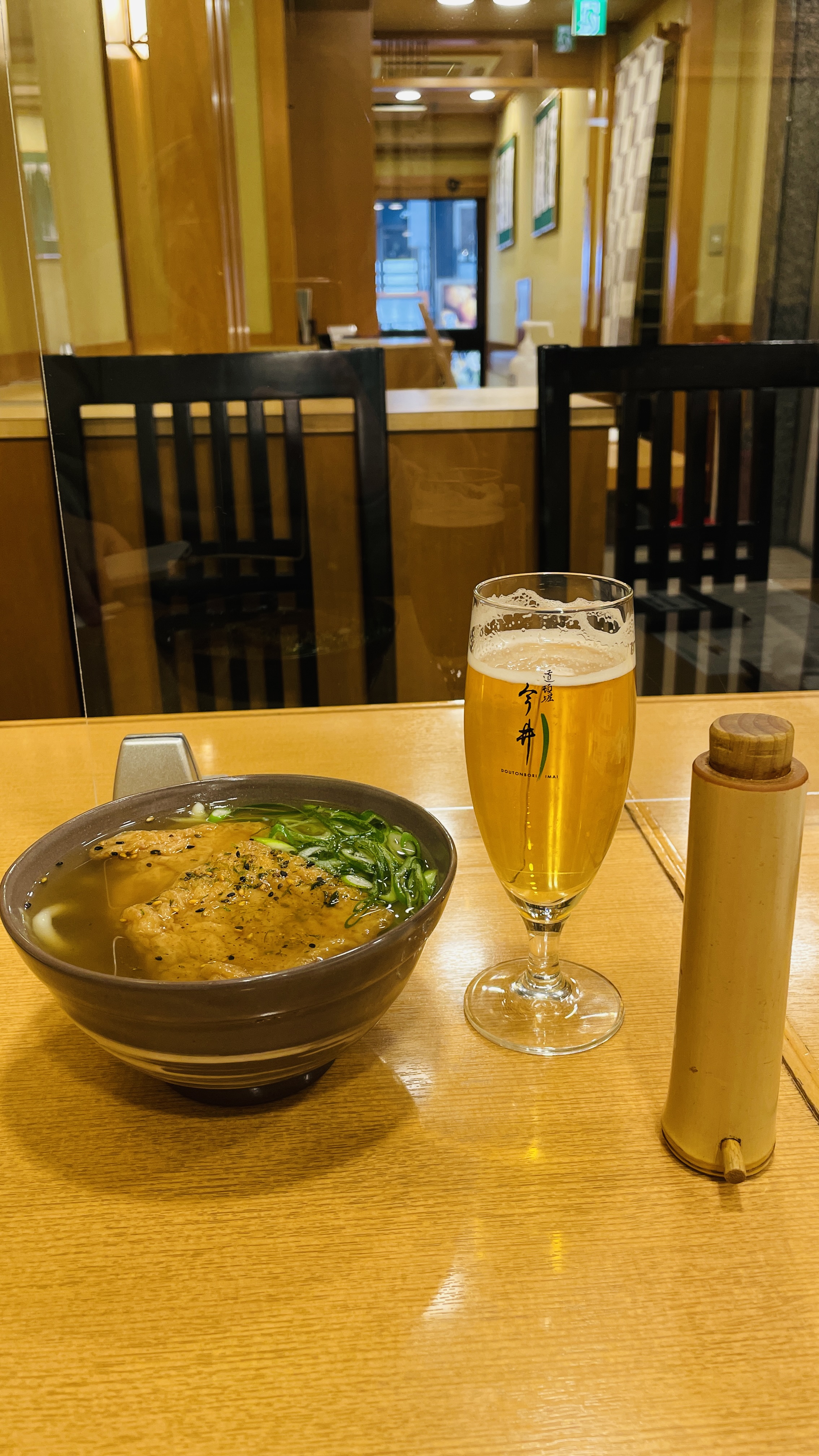 아침부터 생맥주 한 잔 작은걸로 시켰더니 우동과 정말 잘 어울렸다