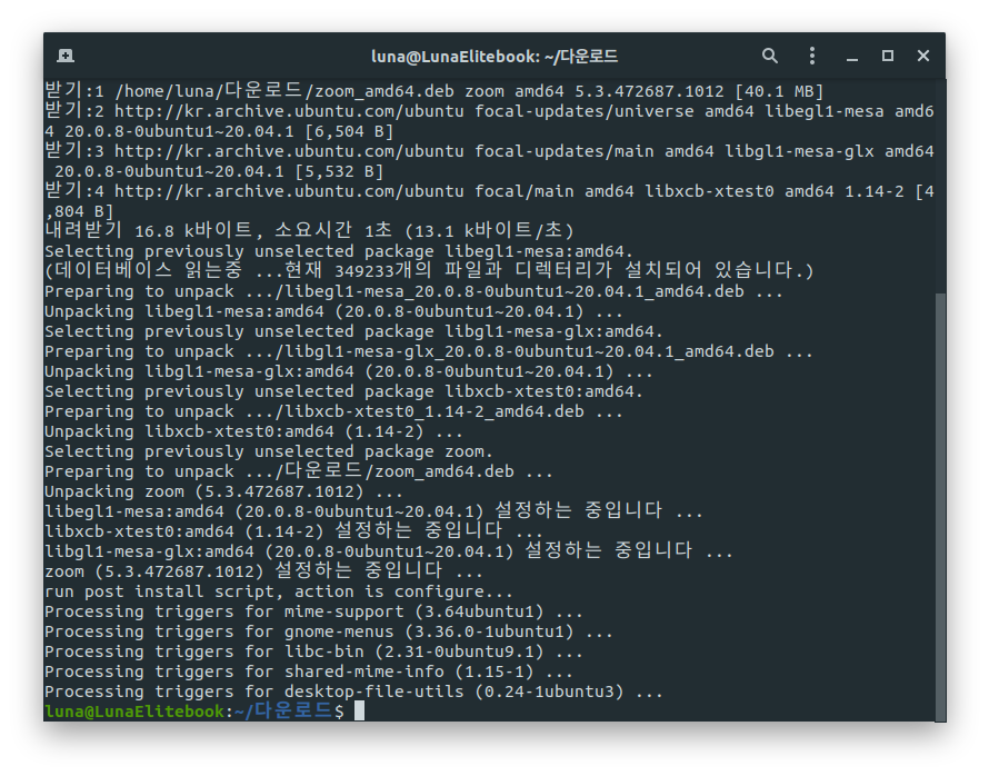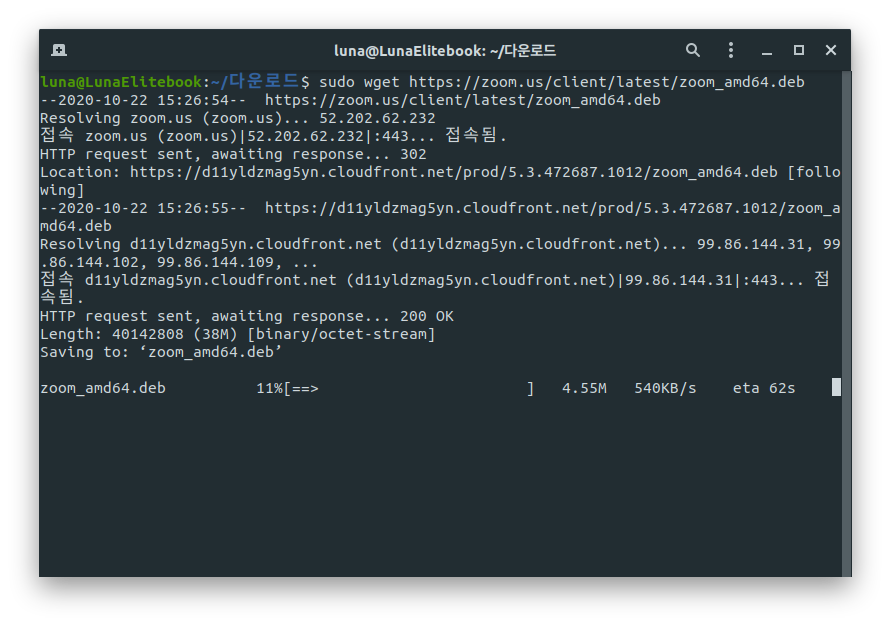 맨 마지막 줄은 현재 zoom_amd64.deb 파일을 다운받고 있는 모습이다.